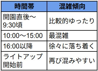 できるだけ快適に楽しむためには、開園前に到着する、夕方に時間をずらす、前売りチケットを利用するなどの対策が効果的です。