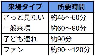 ここでは来場スタイル別に所要時間の目安を紹介します。