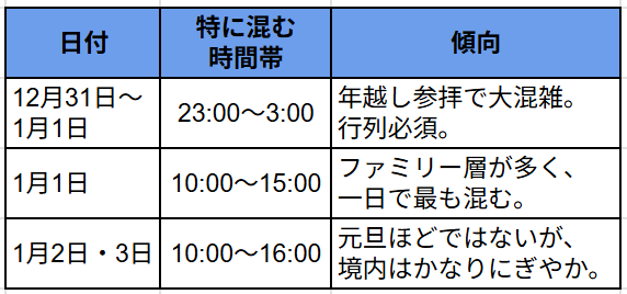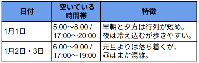 一方で、日中(10〜16時)はピークで、特に1月1日・2日・3日の昼は混雑しやすいため、余裕を持って行くか時間をずらすのが安心です。