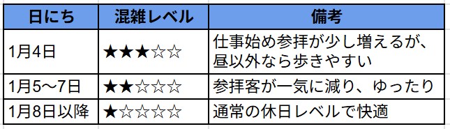 「混雑をできるだけ避けたい」という方は、三が日を外すのがいちばんの近道です。