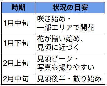 しっかり咲いた景色を楽しみたいなら、1月下旬〜2月上旬の週を狙うのが安心です。
