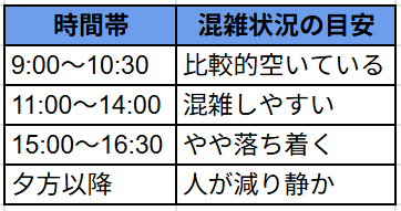 同じ日でも、時間帯によって体感の混雑度はかなり変わります。