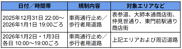 2025年〜2026年の年末年始、川崎大師周辺では以下の通り、公式に交通規制が発表されています。