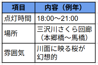 例年の三沢川桜まつりでは、以下の内容でライトアップが行われています。
