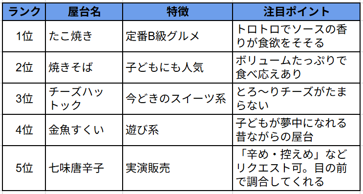 毎年人気の屋台の中から、実際に訪れた人たちの口コミや定番メニューをもとにおすすめを厳選!