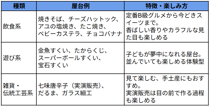 せっかく行くならいろんな屋台を楽しみたいですよね。