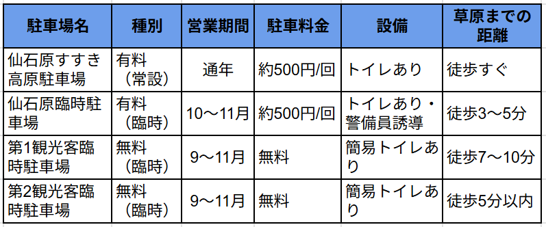 ハイシーズンには臨時駐車場も開設される見込みなので、事前に駐車場情報を確認しておきましょう。