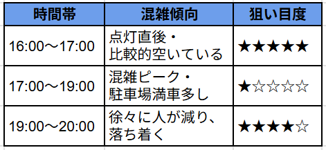 - 混雑ピーク時間:17:30〜19:00(点灯直後から早い時間帯)