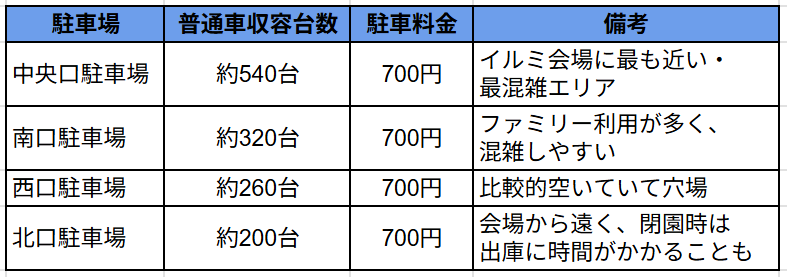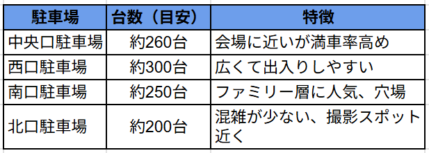 駐車場は中央口が最も便利な一方、混雑も激しいため、到着は16時半までを目安に行動を。