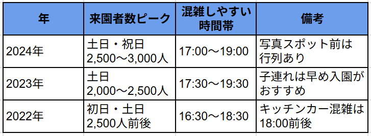 ここでは、過去の混雑傾向や曜日・時間帯ごとの目安、子ども連れでの注意点をまとめました。
