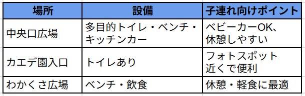 園内はベビーカーでも通りやすく、多目的トイレや休憩ベンチも充実しているので、子連れでも安心して楽しめます。