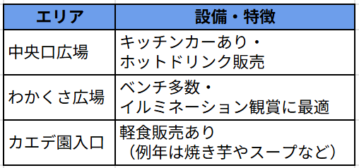 - カエデ園:紅葉とイルミネーションが調和するメイン会場
