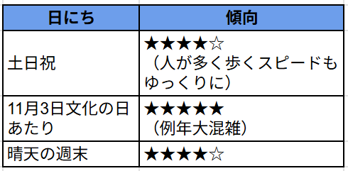 混雑は「土日・祝日」「11月中旬のピーク週」「ライトアップ期間」の3つが特に人が増えるタイミング。