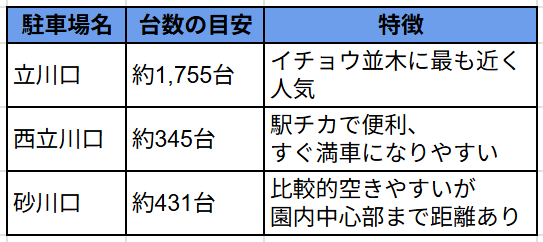 昭和記念公園の駐車場(三か所)