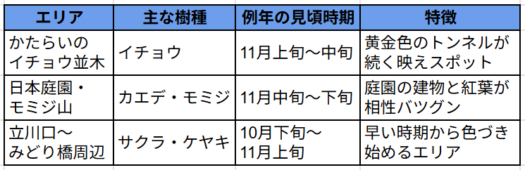 特に「イチョウ並木」と「日本庭園のカエデ」は見頃がズレるので、訪れる日で楽しみ方が変わります。