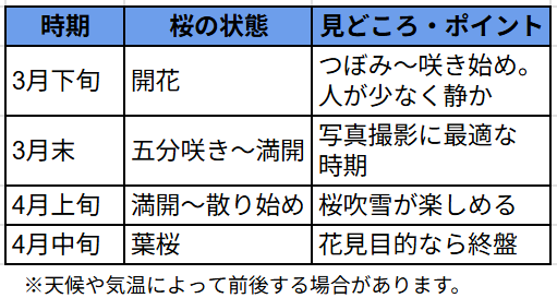 ここでは、例年の見頃時期やエリアごとの咲き方の違い、さくらまつりの開催傾向についてご紹介します。