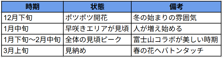 暖冬傾向が強ければ、例年より少し早めに花が進む可能性もあり、1月中旬から満開に近いエリアが出てきそうです。