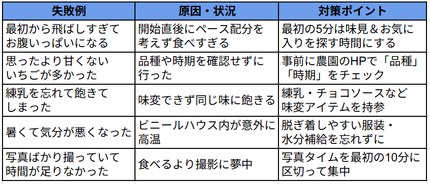 よくある失敗例と対策表(いちご狩りで元を取るために)