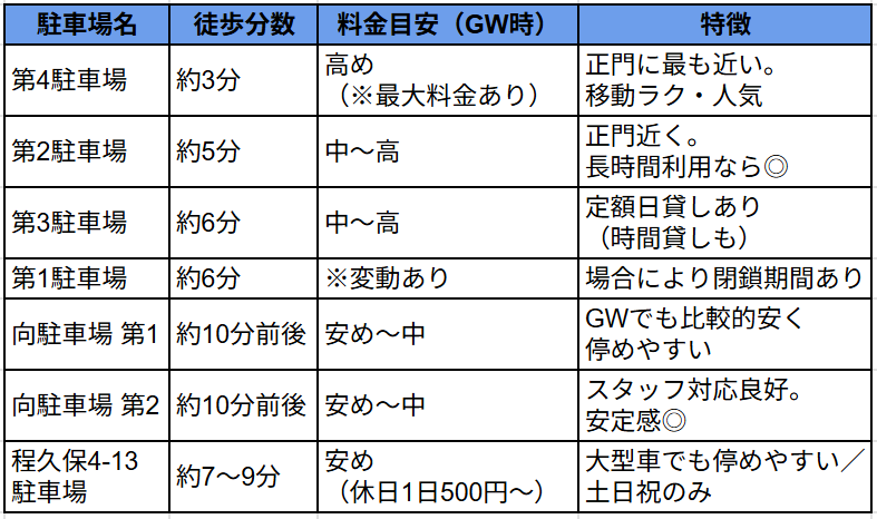 - 安め〜中:民間駐車場。GWでもリーズナブルな日もある(※早め到着が鍵)