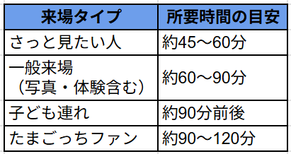 ここでは来場スタイル別に、所要時間の目安を分かりやすくまとめました。