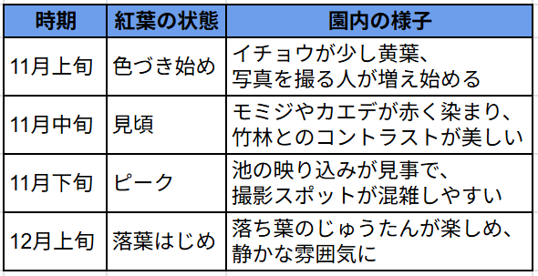 庭園内の場所によって日当たりが異なるため、色づきのタイミングが少しずつずれるのも特徴です。
