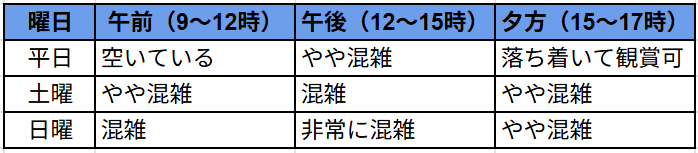 以下の表は、曜日と時間帯ごとの混雑目安です。